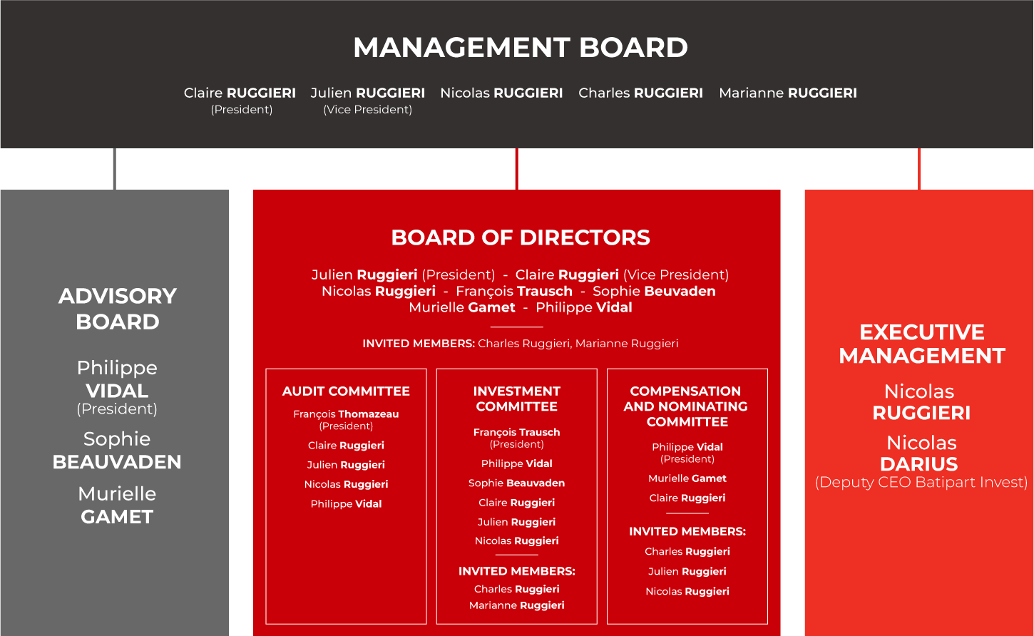 The Management Board is composed of the five family members and is chaired by Claire Ruggieri. Decisions within this board are taken unanimously.